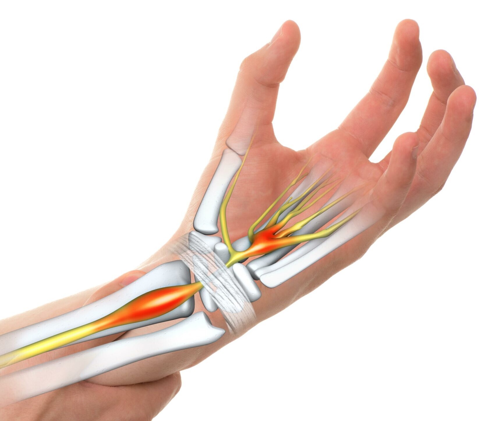 Анатомические особенности играют ключевую роль в развитии туннельного синдрома. Запястный канал — это узкое пространство, ограниченное костями запястья и поперечной связкой. Через этот туннель проходят сухожилия сгибателей пальцев и срединный нерв, который отвечает за чувствительность большого, указательного, среднего и части безымянного пальцев, а также за движение мышц возвышения большого пальца.