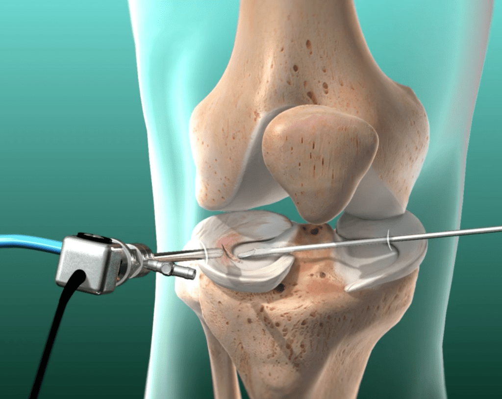 Современная менискэктомия выполняется артроскопическим методом — через два небольших прокола (5-7 мм). В один вводится миниатюрная камера, в другой — хирургические инструменты.